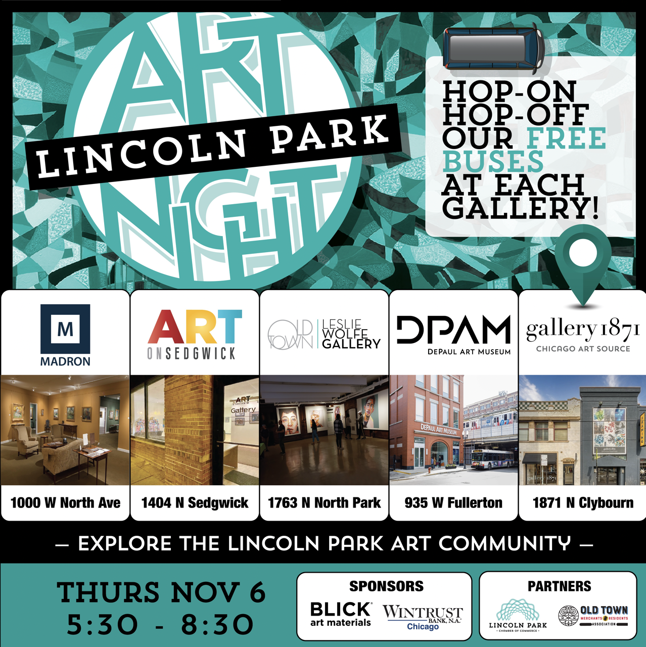 DePaul Art Museum, gallery 1871, Madron Gallery, Art on Sedgwick, and Leslie Wolfe Gallery, are participating in the fourth annual Lincoln Park Art Night. Five unique art locations have banded together to celebrate their Lincoln Park neighborhood and promote a destination for art lovers that is too-frequently overlooked. The event is FREE and open to all. Luxury sprinter vans will circulate the neighborhood offering hop-on/hop-off service for three hours on Thursday, November 6th from 5:30 - 8:30 PM. Riders may start and stop at any of the five participating locations.